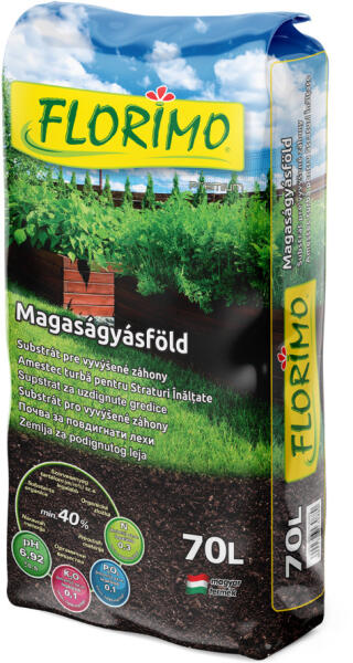 A Florimo magaságyás virágföld összetétele: sphagnum mohatőzeg, síkláptőzeg, komposztált marhatrágya, agyag és műtrágya keverék. A tőzeg könnyíti és lazítja a talajt, javítja a vízmegtartást és segíti a szárazsághoz való alkalmazkodást. A komposztált marhatrágya azonnal felvehető tápanyagot biztosít, míg az agyag javítja a vízmegkötést és stabilizálja a szerkezetet. Ez a közeg ideális kerti virágok, cserjék, zöldségnövények – például paprika, paradicsom vagy uborka – ültetéséhez. A bekevert műtrágyák pótolják a talajban hiányzó nitrogént, foszfort és káliumot, így biztosítva a bőséges termést és a hosszú távú fejlődést. Jellemzők